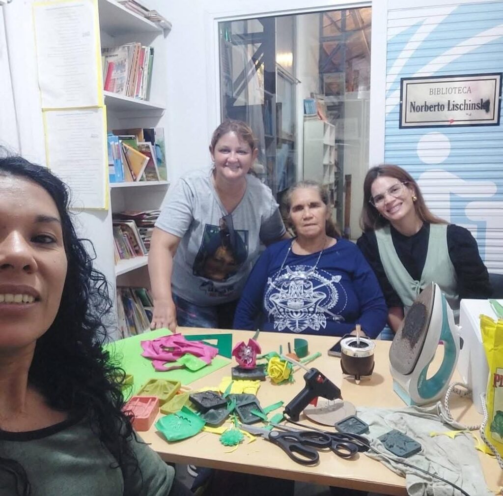 Uno de los grupos más activos del Centro Cultural La Estación es el de mujeres del barrio, quienes se reúnen semanalmente para coser y crear flores de goma eva, transformando los materiales en arte, afecto y redes de apoyo mutuo. Este espacio es una muestra viva de la fuerza colectiva y el compromiso.