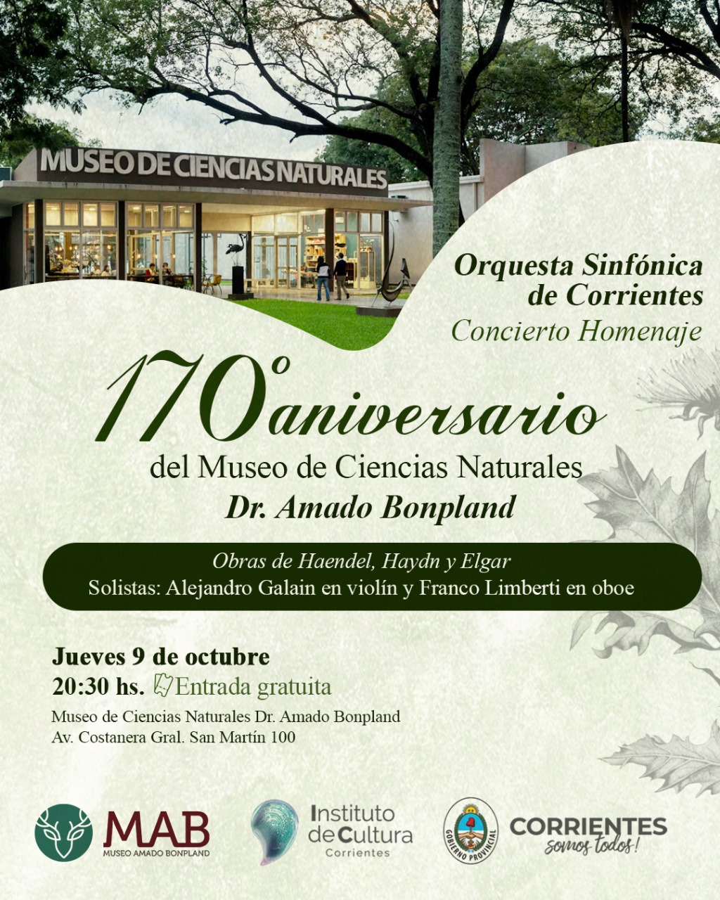 En el marco de las celebraciones por el 170º aniversario de su fundación, el Museo de Ciencias Naturales Amado Bonpland (Av. Costanera Gral. San Martín 100) será el escenario de un concierto especial a cargo de la Orquesta Sinfónica de la Provincia, que se llevará a cabo el próximo jueves 9 de octubre, a las 20:30, con acceso libre y gratuito.