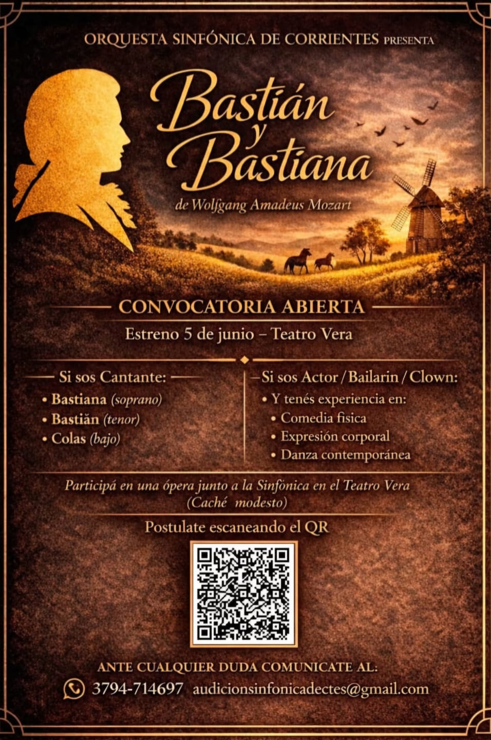 El Instituto de Cultura de Corrientes, a través de la Orquesta Sinfónica de Corrientes, lanza una convocatoria abierta a cantantes, actores y bailarines para participar en la producción de la ópera Bastián y Bastiana, una de las primeras composiciones escénicas del reconocido músico austríaco.