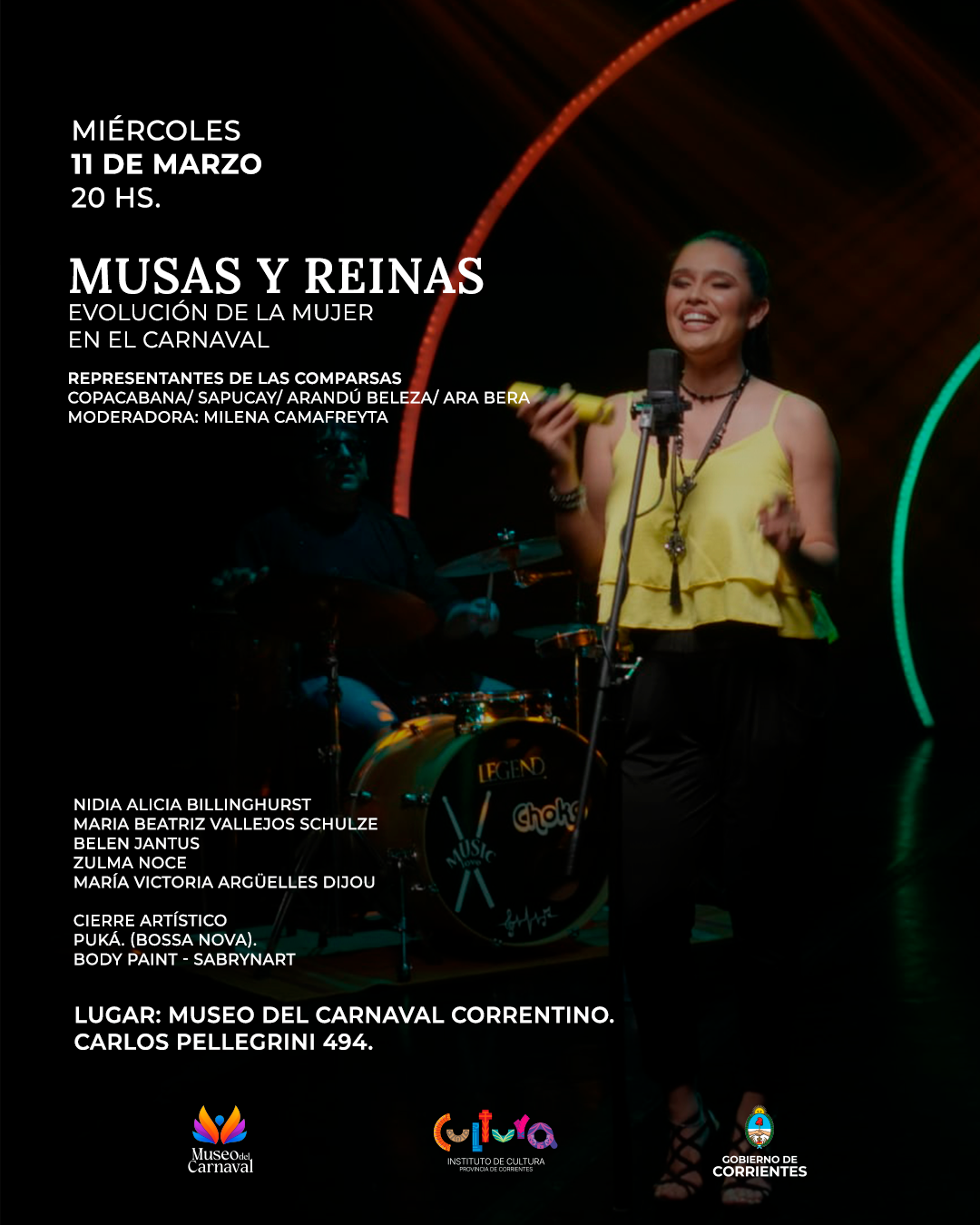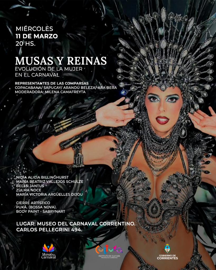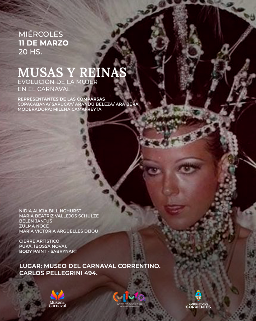 Organizado por el Instituto de Cultura de Corrientes, en el marco del ciclo “Cultura en clave de mujer”, este miércoles 11 de marzo, a las 20, se realizará el panel “Musas y Reinas: Evolución de la Mujer en el Carnaval”, en el Museo del Carnaval Correntino (Pellegrini 494).