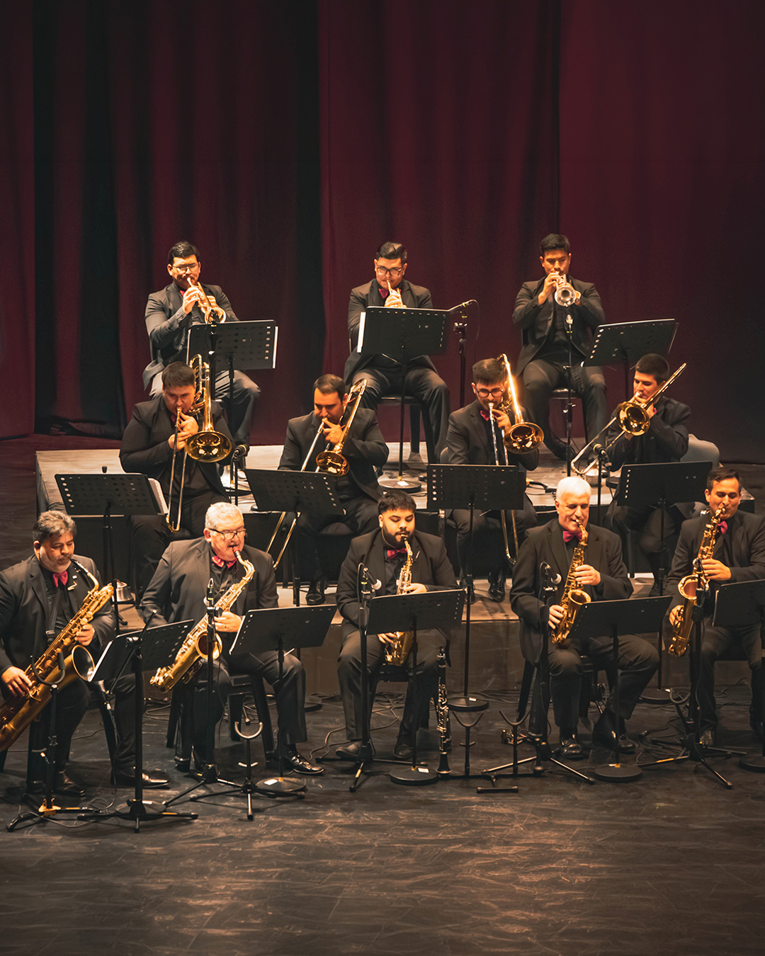 Bajo la dirección musical del Saxofonista Aníbal Aguirre, la Big Band Jazz reúne a un selecto cuerpo de instrumentistas —vientos, base rítmica y voces— que asumen el desafío técnico y expresivo de interpretar el género swing. La agrupación logra amalgamar la disciplina de la música académica con la libertad y el pulso vibrante característicos de las grandes orquestas de jazz de la era dorada.