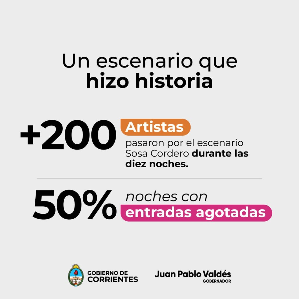 Estos números favorables para Corrientes, en parte se explican en la puesta en escena en el Cocomarola, por donde pasaron más de 200 artistas y lograron agotar las entradas el 50% de las 10 noches.