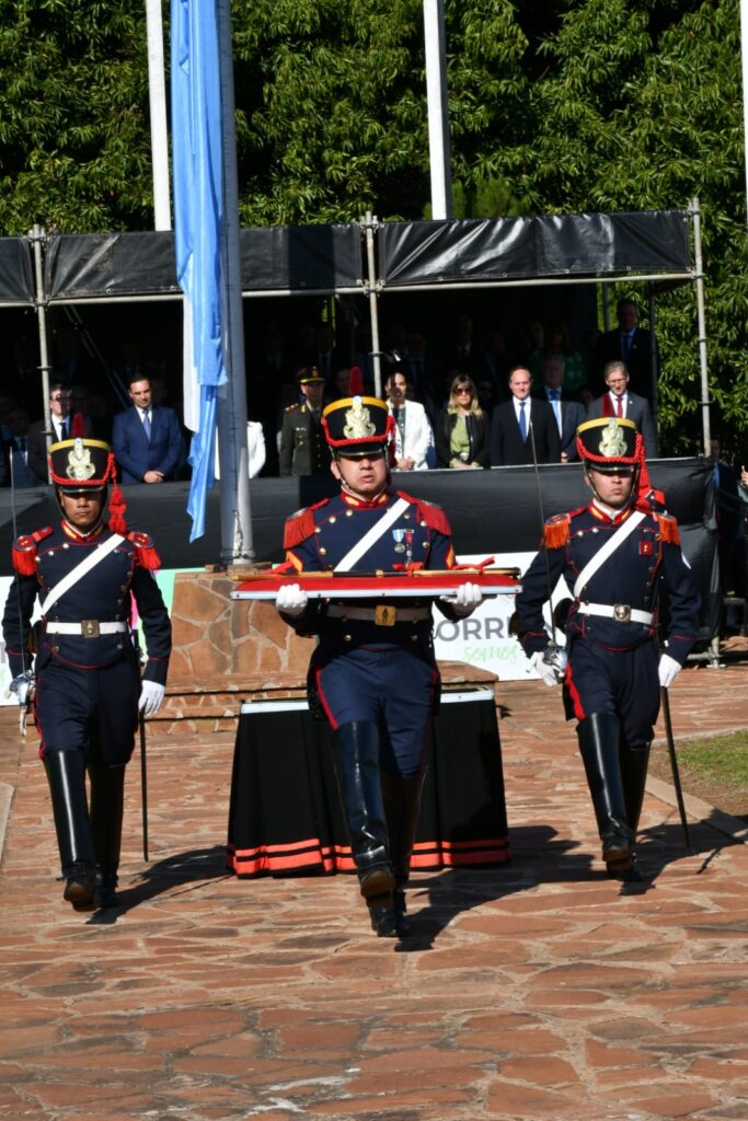 A continuación, se procedió a la entonación del Himno Nacional a cargo de la Banda Militar “Vuelta de Obligado” del Grupo de Artillería de Monte III, con asiento en la localidad de Paso de los Libres. El padre Fausto Simón realizó la bendición del acto.